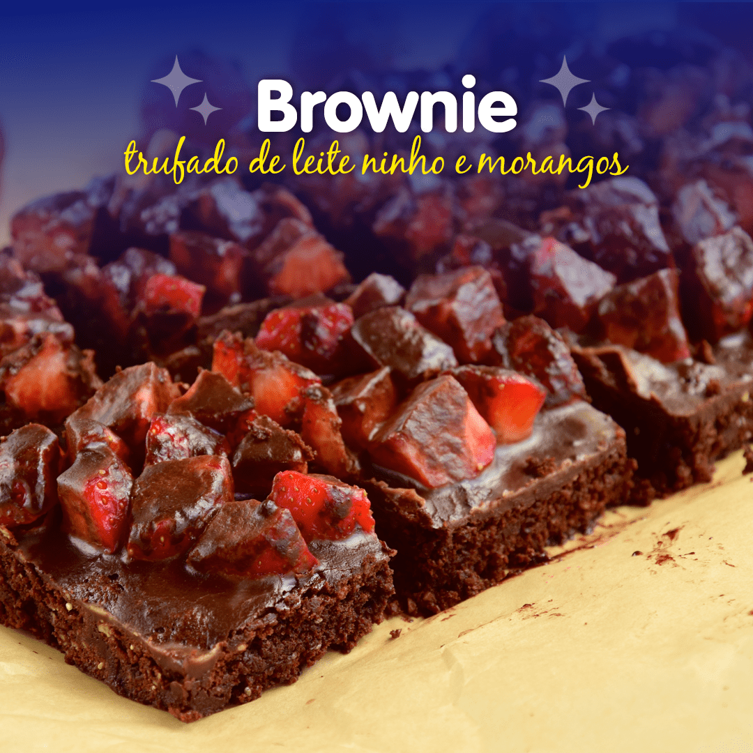 Brownie trufado de leite ninho e morangos